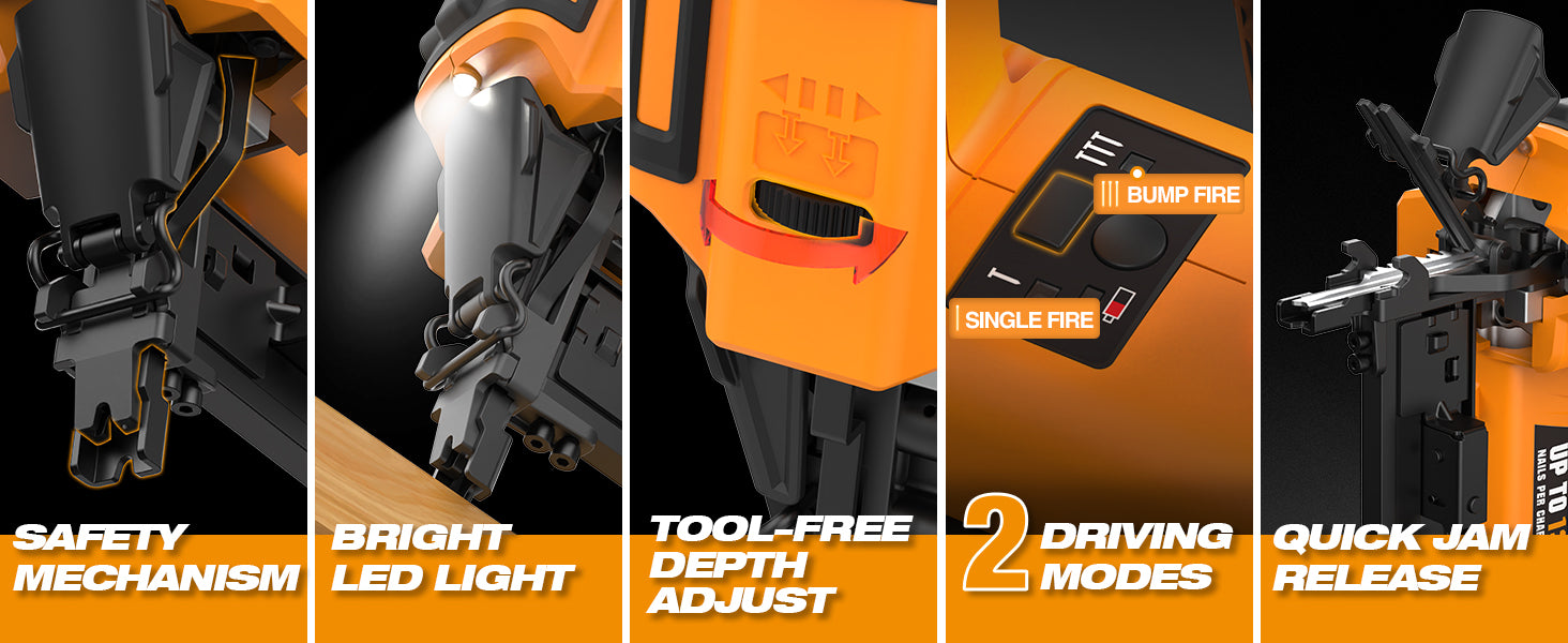 The cordless electric design eliminates the need to be tethered to a loud and heavy air compressor, improving mobility around the house, ranch, farm, or jobsite. Use the select fire button to easily switch between sequential firing for precision and bump firing for speed. A depth adjustment wheel, quick jam release, and wire alignment notch ensure accurate, uninterrupted fastening.