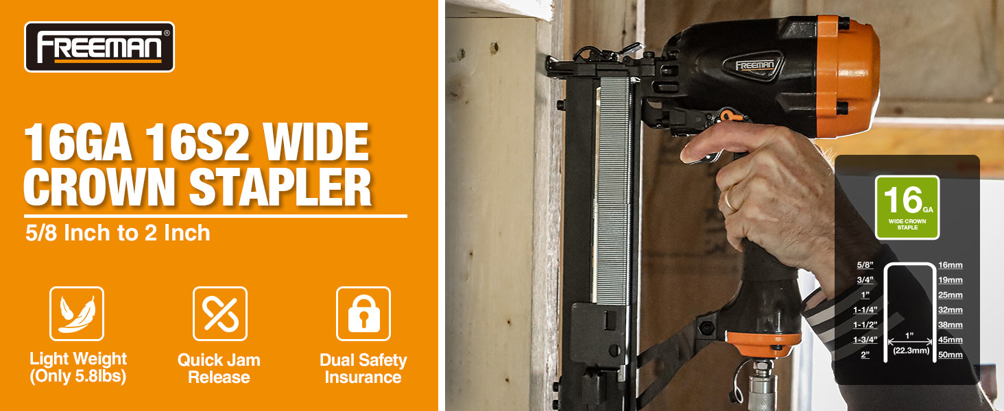 The Freeman Pneumatic 16 Gauge 1" Wide Crown Stapler for Freeman, DeWalt® or Bostitch® 16S2 Series Staples is built for demanding stapling applications in truss assembly, roofing, sheathing, lathing, foam board insulation, house wrap, wood fencing, stucco, furniture framing, cabinet frames, pallets, and general construction.