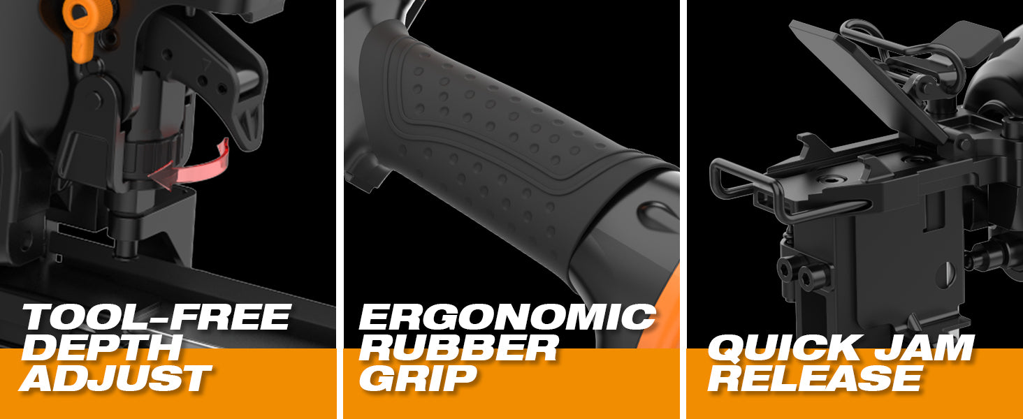 This lightweight and durable air-powered staple gun features a fire lock, tool-free depth adjustment, quick jam release, and a comfort grip handle, delivering consistent performance and reducing fatigue on the job.