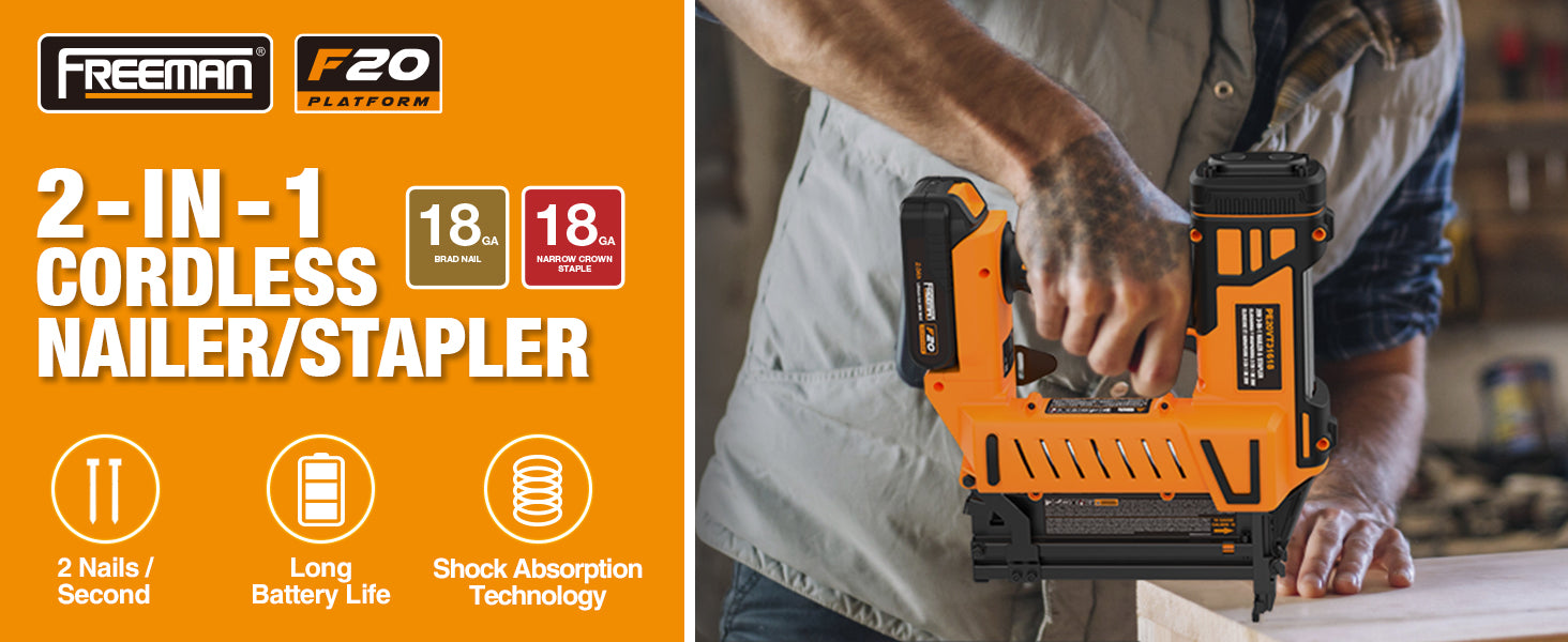 The 20 Volt Cordless 18 GA 2" Nailer / Stapler Kit will significantly increase the productivity of DIYers and construction contractors tackling finish projects, includes a battery, rapid charger, canvas bag, belt hook, and 400 fasteners, and is covered by Freeman’s 1 Year Professional Tool Warranty.