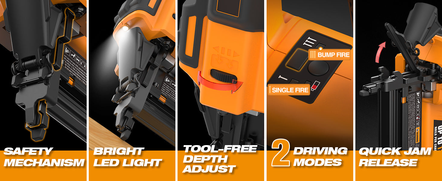 The cordless electric design eliminates the need to be tethered to a loud and heavy air compressor, improving mobility around the house or jobsite. A 2-in-1 multi-purpose magazine allows both nailing and stapling with just one tool. Use the select fire button to easily switch between sequential firing for precision or bump firing for speed. A depth adjustment wheel, quick jam release, and no mar tip ensure clean and accurate fastener placement.