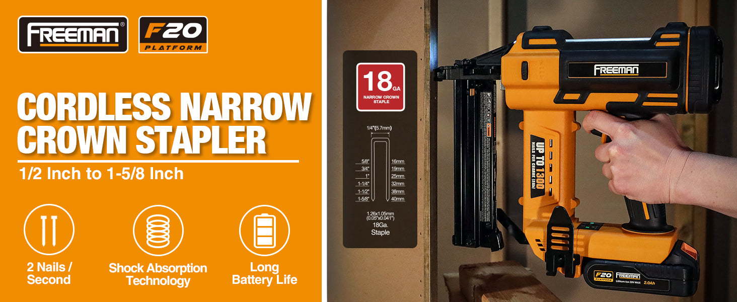 The 20 Volt Cordless 18 GA 1-5/8" Narrow Crown Stapler Kit increases productivity for DIYers and construction professionals alike, and includes a battery, rapid charger, canvas bag, belt hook, and 200 staples. Backed by Freeman’s 1 Year Professional Tool Warranty.