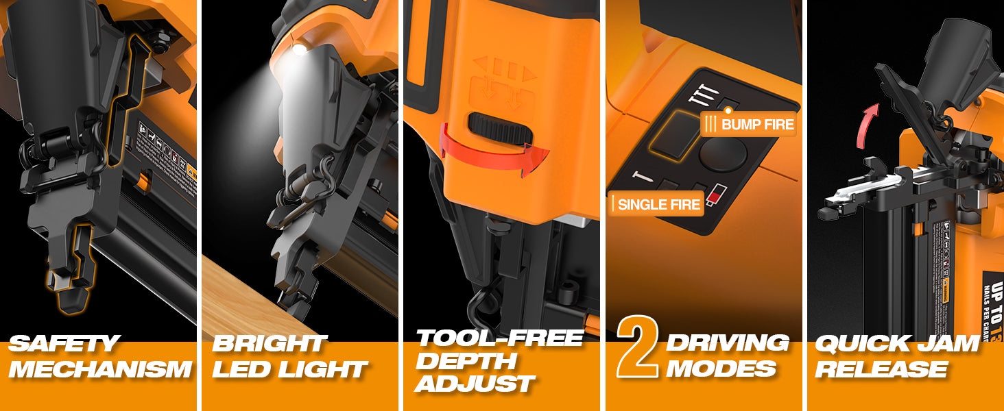 The cordless electric design eliminates the need to be tethered to a loud and heavy air compressor, improving mobility around the house or jobsite. Use the select fire button to easily switch between sequential firing for precision or bump firing for speed. A depth adjustment wheel, quick jam release, and no mar tip ensure clean, accurate fastening without damaging surfaces.