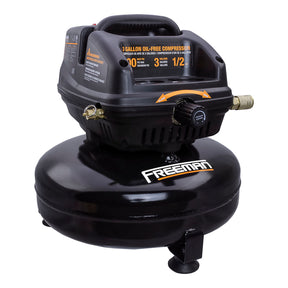 The 3 Gallon 1/2 HP Portable Electric Oil-Free Pancake Air Compressor is designed for DIYers at home as well as professional construction contractors at the job site, and is covered by Freeman's 1 Year Limited Warranty.