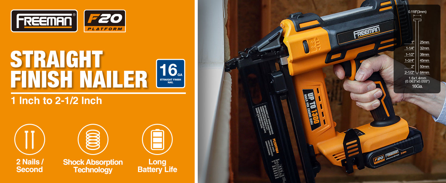 The 20V Cordless 16 GA 2-1/2" Straight Finish Nailer Kit enhances productivity for DIYers and construction contractors alike, and includes a battery, rapid charger, canvas bag, belt hook, and 200 nails. Covered by Freeman’s 1 Year Professional Tool Warranty.