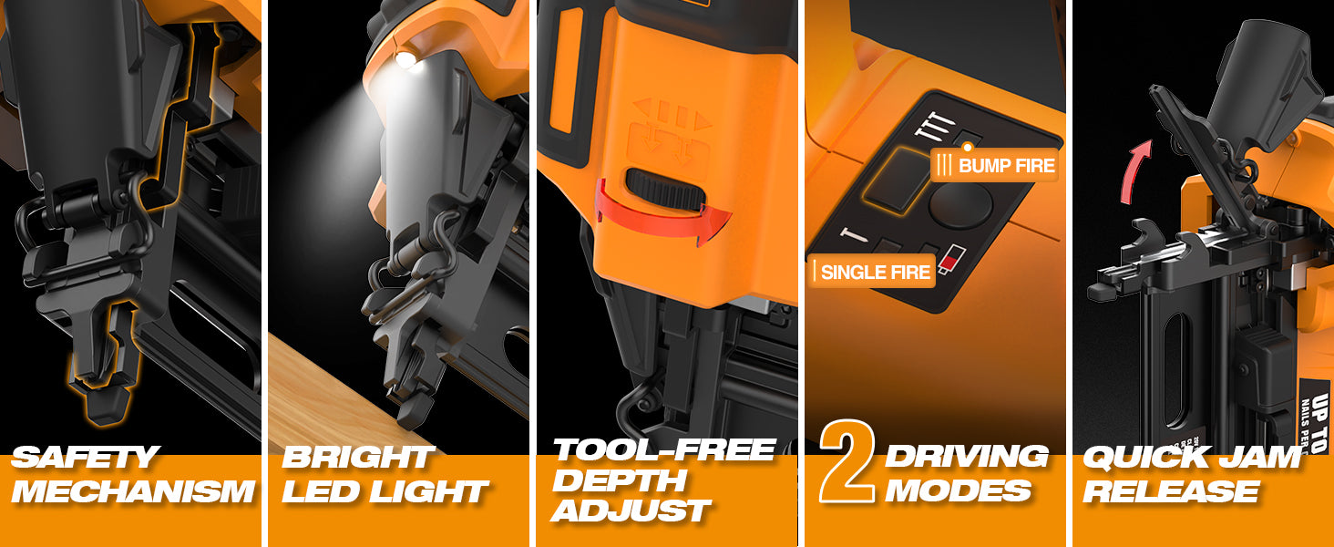 The cordless electric design eliminates the need to be tethered to a loud and heavy air compressor, improving mobility around the house or jobsite. Use the select fire button to easily switch between sequential firing for precision or bump firing for speed. A depth adjustment wheel, quick jam release, and no mar tip ensure clean and professional fastener placement on every project.