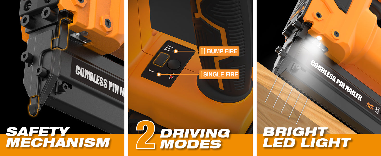 The 20V Cordless 23 GA 1-3/8" Pin Nailer Kit will significantly increase the productivity of DIYers and pros tackling detail work and trim applications, includes a battery, rapid charger, canvas bag, belt hook, and 1000 nails, and is covered by Freeman’s 1 Year Professional Tool Warranty.