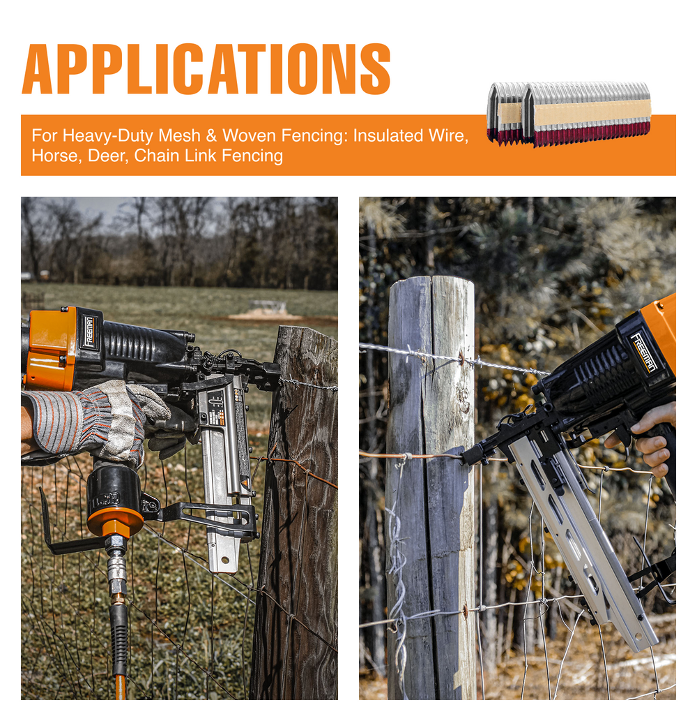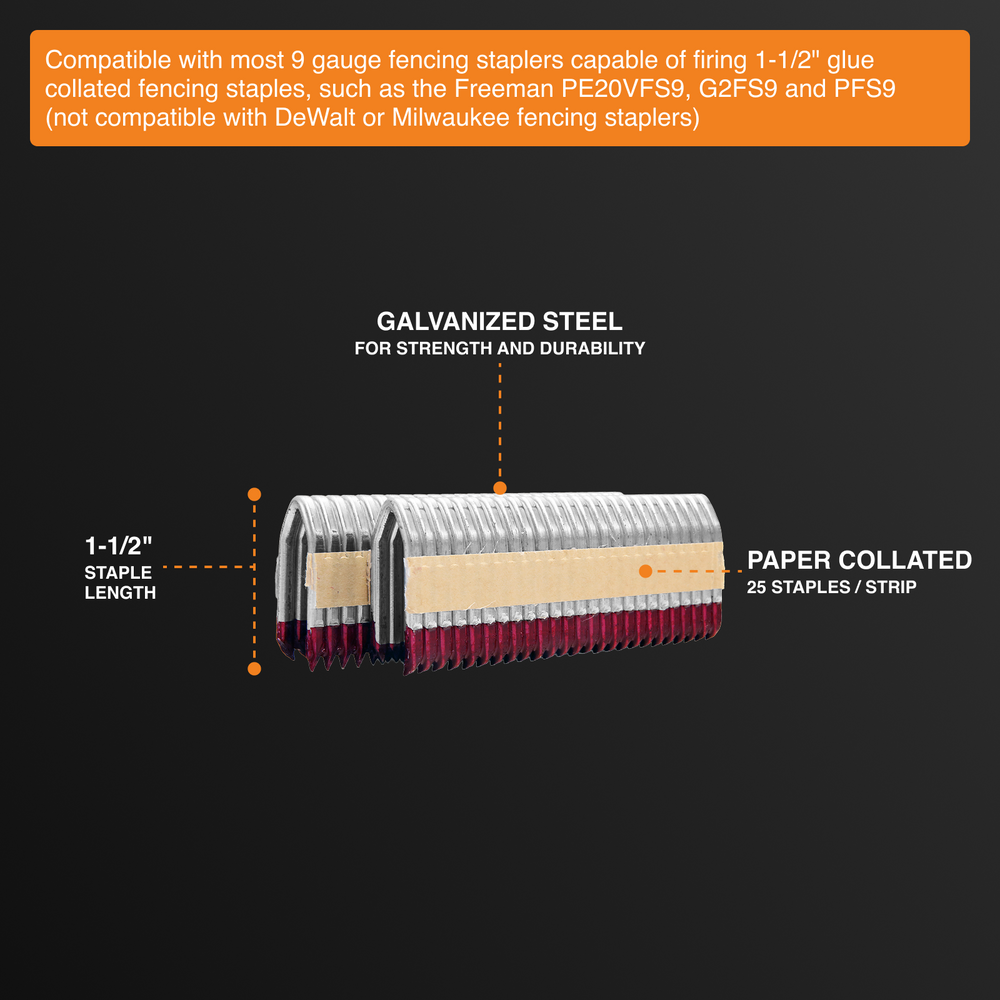 Freeman 9 Gauge 1-1/2" Glue Collated Fencing Staples (500 Count) are ideal for heavy duty mesh and woven projects such as such as electrified single wire with insulation, horse and deer fencing, and chain link fencing.
