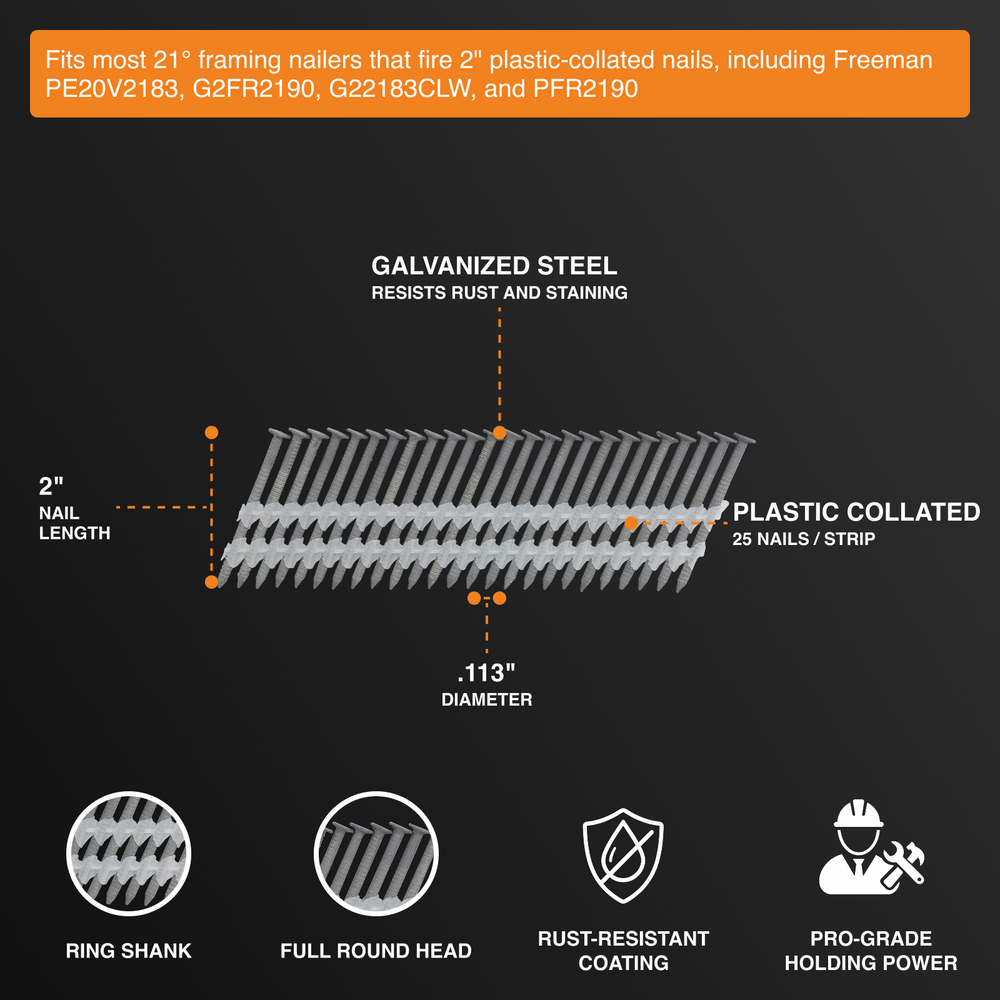 21 Degree .113" x 2" Plastic Collated Galvanized Ring Shank Full Round Head Framing Nails (2000 Count)