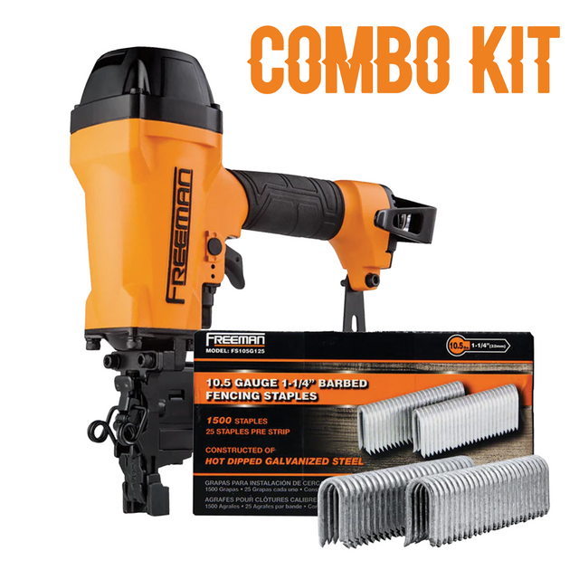 Built for contractors and pros who don’t have time to slow down, the Freeman 2nd Generation Pneumatic 10.5-Gauge Fencing Stapler is optimized for performance, control, and reliability. Matched with a 1,500-count box of 1-1/4" glue-collated barbed staples, this kit is ideal for containment fencing, trellising, and tight-frame projects that demand fast, durable fastening.
