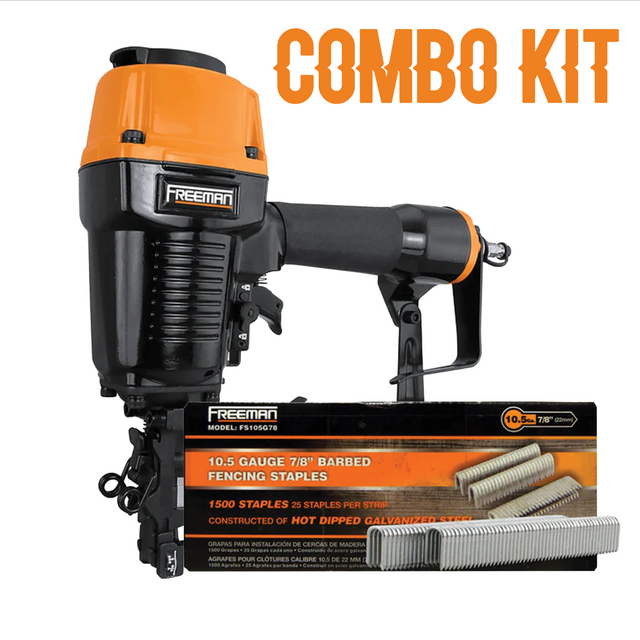 Get precision and power in one streamlined setup. This Freeman combo includes the Pneumatic 10.5-Gauge Fencing Stapler and a 1,500-count box of 7/8" glue-collated barbed staples, designed for close-range fastening tasks in fencing, electrical, and heavy mesh applications.