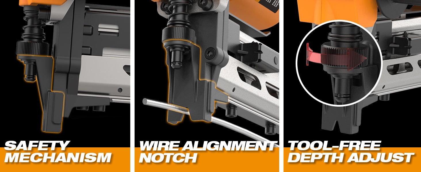 The cordless electric design eliminates the need to be tethered to a loud and heavy air compressor, improving mobility around the house, ranch, farm, or jobsite. A depth adjustment wheel near the drive blade and a wire alignment notch ensure accurate fastener placement.
